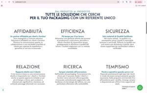 Sezioni “Prodotti” specifiche, che dividono il packaging per settore: abbigliamento, alimentare, automotive, biomedicale, vitivinicolo e metalmeccanica, permettendo una ricerca mirata.