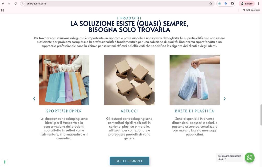 Grazie a questa struttura, il sito non solo mostra la varietà e la qualità dei prodotti di packaging di Andrea Verri, ma diventa un mezzo efficace per costruire fiducia, affermare leadership nel settore e facilitare nuove collaborazioni.