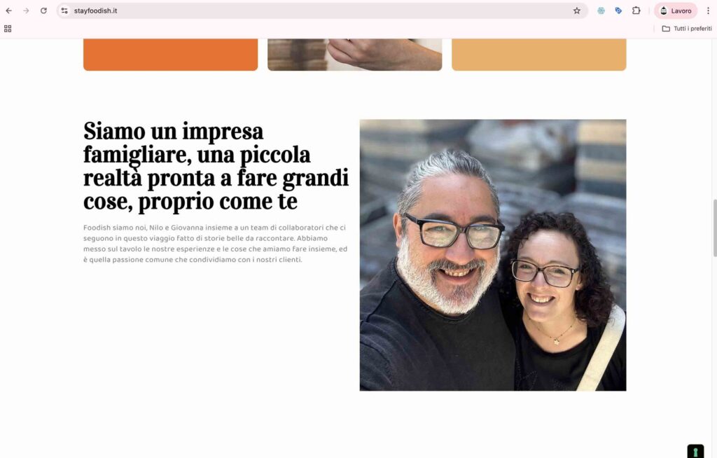 ● Sezione “Chi siamo” che rafforza identità, presentando il team (Nilo e Giovanna) e la filosofia aziendale: lavoro con passione, storie buone da raccontare.