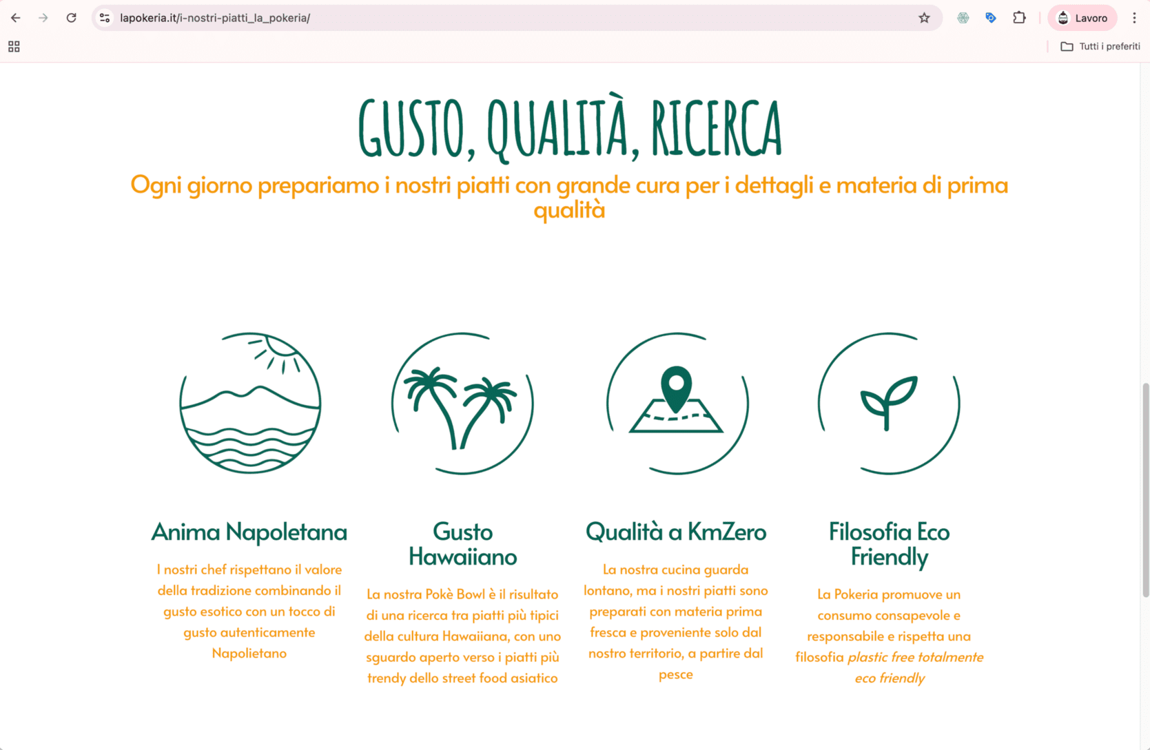 ● Contenuti coinvolgenti, che descrivono i valori del brand (“Anima napoletana, gusto hawaiano”), le varianti di poké bowl e le opzioni per esigenze alimentari (vegan, gluten free).