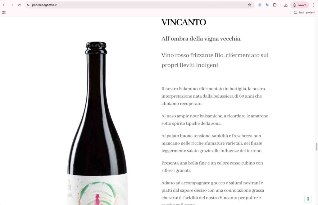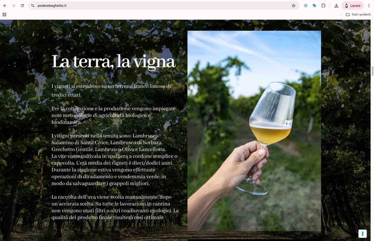 Podere Beghetto è un’azienda vitivinicola biologica a conduzione familiare situata a Gargallo, frazione di Carpi (MO). Produce vini naturali e organici—come Lambrusco Salamino, Sorbara e Trebbiano di Spagna—attraverso metodi biologici e pratiche biodinamiche. Forte di una tradizione che affonda le radici nel passato (nato da un’antica osteria del 1943), il cliente desiderava una presenza digitale capace di valorizzare la qualità, la storia, il territorio e l’approccio sostenibile, offrendo al contempo informazioni chiare sui vini e sulle esperienze in azienda (degustazioni, tour e visite guidate).