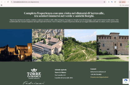 Torre Ca’ Bianca è un’azienda agricola e vitivinicola situata nel territorio di Valsamoggia (BO), immersa tra vigneti secolari e colline affascinanti. Offre esperienze sensoriali che uniscono vino, natura e storia, permettendo ai visitatori di scoprire il territorio con degustazioni, passeggiate nei vigneti e visite al borgo medievale adiacente. L’obiettivo del cliente era creare una sezione web dedicata alla prenotazione delle degustazioni che comunicasse atmosfera, qualità e ospitalità, rendendo il processo chiaro, coinvolgente e facilmente accessibile.
